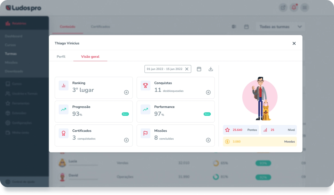 Precisa analisar algum colaborador específico? Não tem problema, com os insights do Ludos Pro você pode em um simples clique, obter informações valiosas sobre cada usuário da sua plataforma.