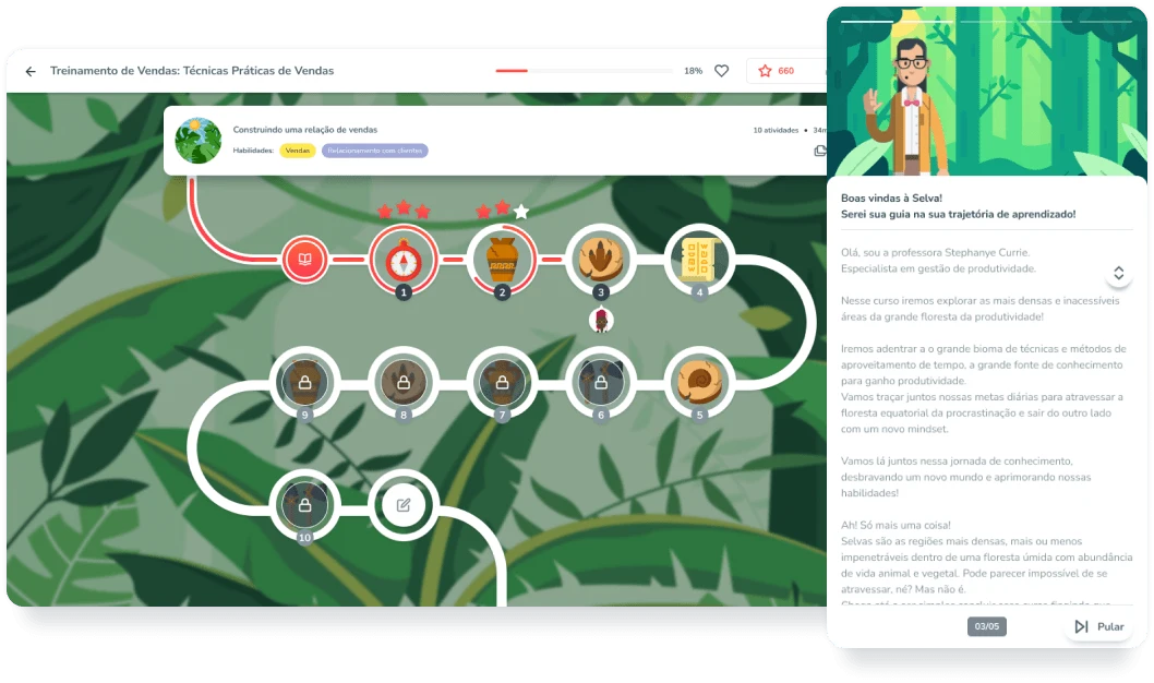 Crie uma trilha de aprendizado com diferentes temas, narrativas, mecânicas e conteúdo, segmentados especificamente para cada tipo de audiência, aumentando a imersão e a absorção do treinamento, tudo isso, com a cara da sua empresa.