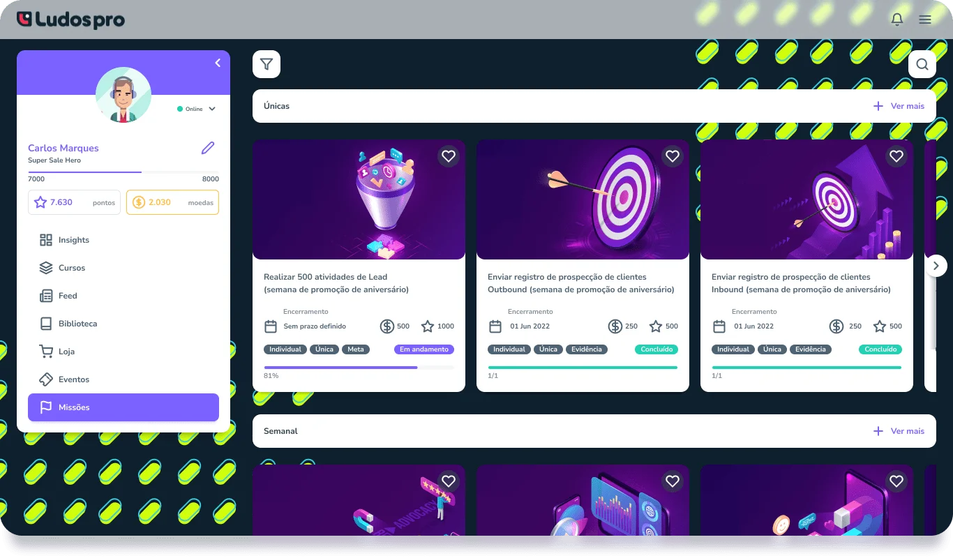 Você pode criar missões para atividades individuais, em grupo ou para todos os seus colaboradores! Defina a periodicidade das suas metas e estimule sua audiência recompensando com pontos e moedas.